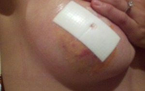 Picture time!  This procedure required a slightly larger incision than the core needle biopsy, and I think is going to leave me pretty bruised for awhile: