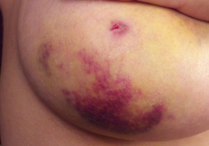 I peeled the surgistrips off of my incision tonight before I showered.  The incision from Monday’s biopsy is still fresh and pretty open.  My boob has a dark purple bruise, and there is bruising around my nipple.  It’s significantly worse than the first biopsy.  I probably should have waited until Bing was home, because looking at Monday’s aftermath just scared me more.  I am dreading looking at myself after surgery already, and I don’t even know what kind of surgery I am going to have.